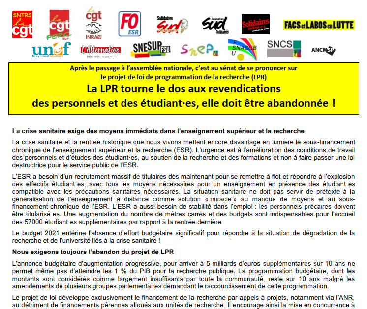 Après le passage à l’assemblée nationale, c’est au sénat de se prononcer sur le projet de loi de programmation de la recherche (LPR).