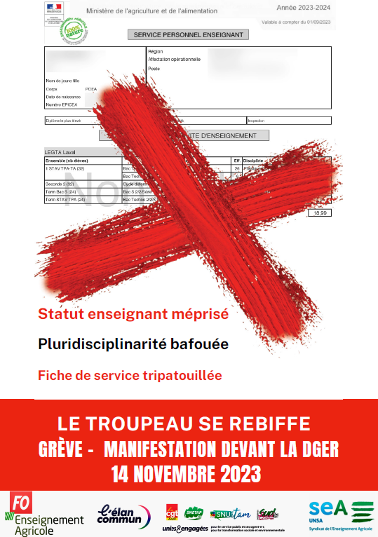 L’intersyndicale de l’Enseignement Agricole Public, représentée par l’ÉLAN COMMUN / FO-EA /SEA-UNSA, dénonce cette stratégie sournoise et exige la correction immédiate des fiches de service dans les établissements où cette démarche abjecte a été mise en oeuvre, afin de préserver l’égalité de traitement pour l’ensemble des enseignant·es.