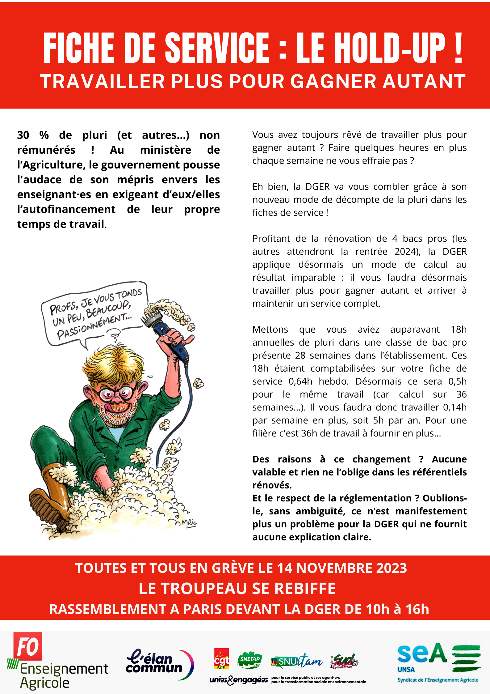 L’intersyndicale de l’EAP (CGT, FO, FSU, UNSA, SUD) appelle donc les personnels à se mobiliser le 14 novembre prochain, à faire grève et manifester à partir de 11h et en après-midi devant les locaux de la DGER Direction Générale de l’Enseignement et de la Recherche (ministère MASA, 1ter Lowendal Paris 7eme) : « Le troupeau se rebiffe » !