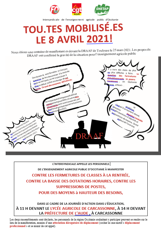 Les deux rassemblements sont déclarés, les personnels de la région Occitanie souhaitant y participer peuvent se rendre sur le lieu de la manifestation, munies d’une attestation dérogatoire de déplacement (cocher la case motif « déplacement professionnel » et se munir de cet appel).