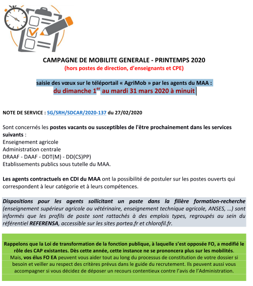 Autres Campagne de mobilité générale printemps 2020 10 mars 2020 admin 816 Views Mobilité Saisie des vœux sur le téléportail «AgriMob » par les agents du MAA : du dimanche 1 er au mardi 31 mars 2020 à minuit
