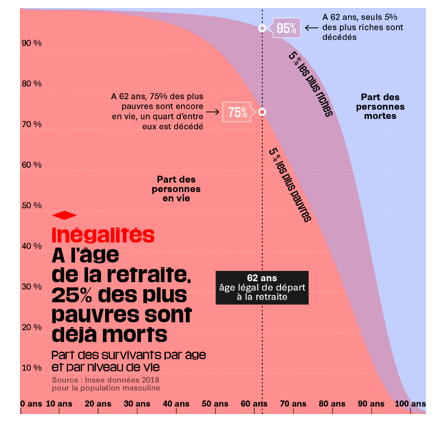 Ceci est faux ! En effet, repousser l’âge de départ à la retraite, c’est faire mourir les classes populaires plus tôt. À l’âge actuelle de la retraite, 25% des plus pauvres sont déjà décédés.