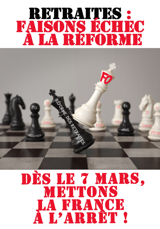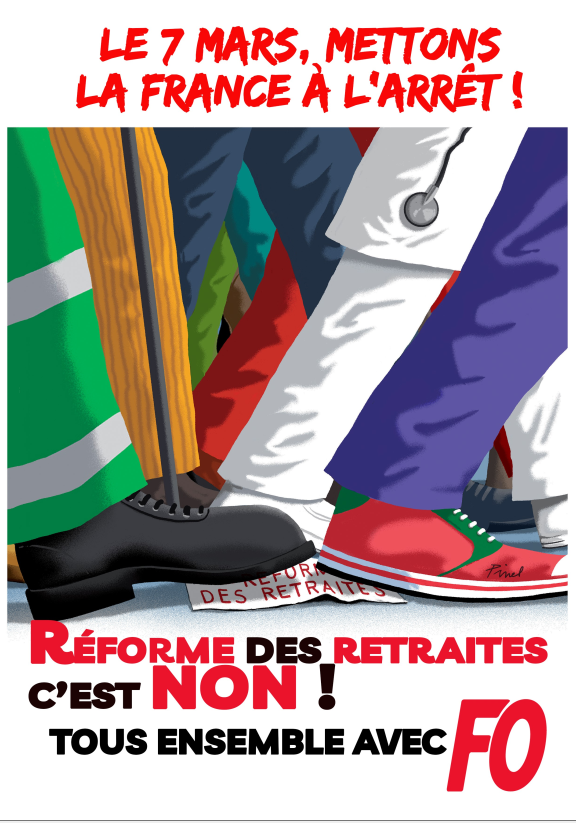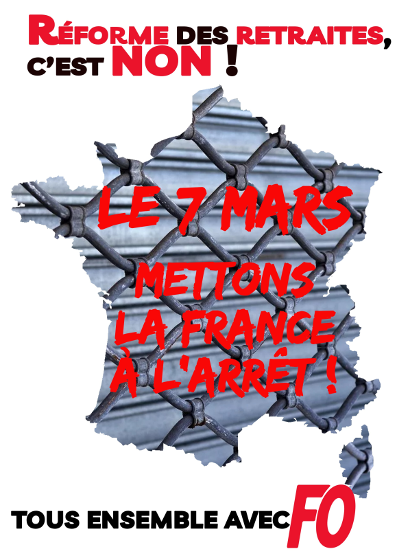 Retraite Affiche pour la mobilisation du 07 mars 24 février 2023 admin 703 Views affiche, Grève, Mobilisation, tract Le 7 mars mettons la France à l’arrêt