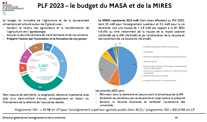 Le budget de l’enseignement supérieur (142) représente 7% du budget du MASA qui est d’environ 6 milliards d’€.