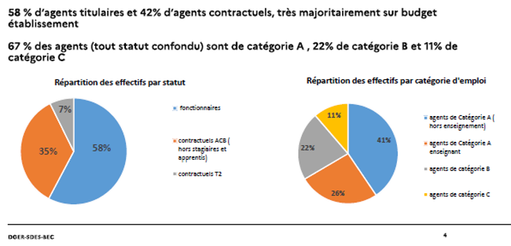 68 % des emplois (ETP) relèvent des fonctions d’enseignement et de recherche (y compris plateaux techniques) et 28 des ETP relèvent des fonctions dites supports et gouvernance.