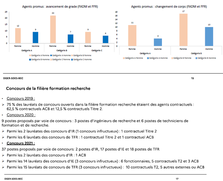 Dans la Fonction publique, il y a 63% de femmes) mais chez les EC 53% d’hommes !! (MC : 54% de femmes, et PR : 41% de femmes). 52% des nouveaux MC sont des femmes.