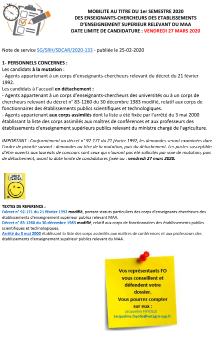 Enseignement SupérieurIngénieur de recherche Mobilité enseignant chercheur 2020 10 mars 2020 admin 769 Views Mobilité Mobilité au titre du 1er semestre 2020 des enseign,ants chercheurs des établissements d’enseignement supérieur relevant du MAA DATE LIMITE DE CANDIDATURE : VENDREDI 27 MARS 2020